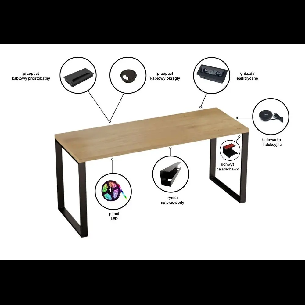 - Panel led: znajduje się na spodzie blatu. Jest elementem wizualnym. Oświetla spód biurka. Kolory można zmieniać dzięki dołączonemu pilotowi.
