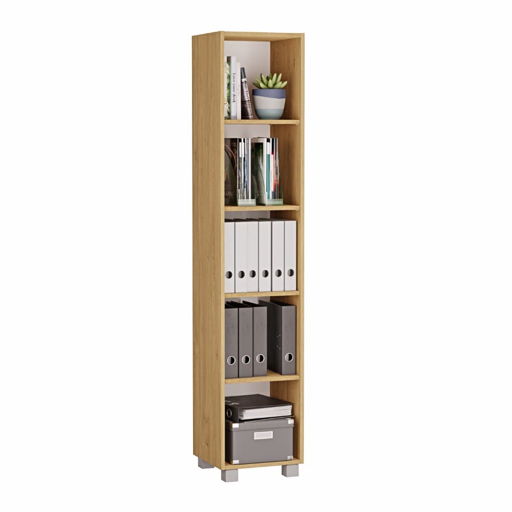 Regał biurowy na segregatory jest przede wszystkim bardzo starannie zaprojektowany, jak chodzi o jego wymiary. Dzięki temu na jego półkach bez problemu można umieścić segregatory i mieć pewność, że ich wyjmowanie nie sprawi problemu. Regał nie jest zbyt szeroki, co z pewnością jest jego plusem. Bez problemu bowiem może być ustawiony niemalże w każdym miejscu. Posiada 4 półki, co umożliwia przechowywanie na nich sporej ilości segregatorów.