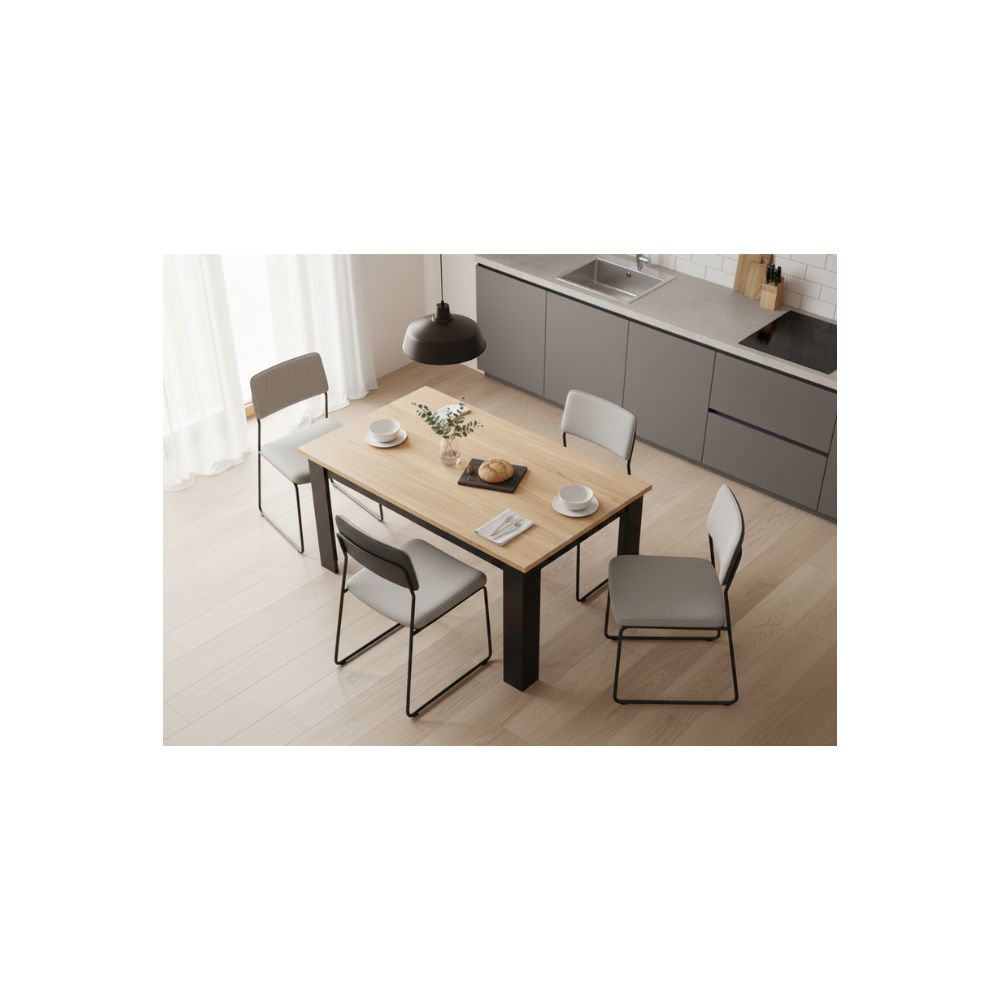 Uniwersalna Kolorystyka: Połączenie blatu w kolorze Dąb Artisan z głęboką czernią nóg to absolutny hit aranżacyjny, który pasuje do kuchni, jadalni oraz salonu.