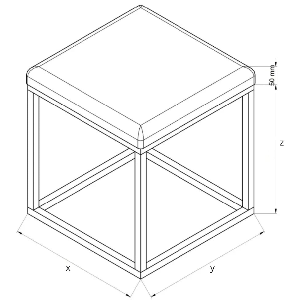 Stelaż pufy wykonany jest ręcznie z metalu o profilu 2x2 cm i malowany proszkowo na elegancką czarną mikrostrukturę. Solidność i estetyka idą tu w parze, co czyni mebel nie tylko trwałym, ale też stylowym dodatkiem do wnętrza.