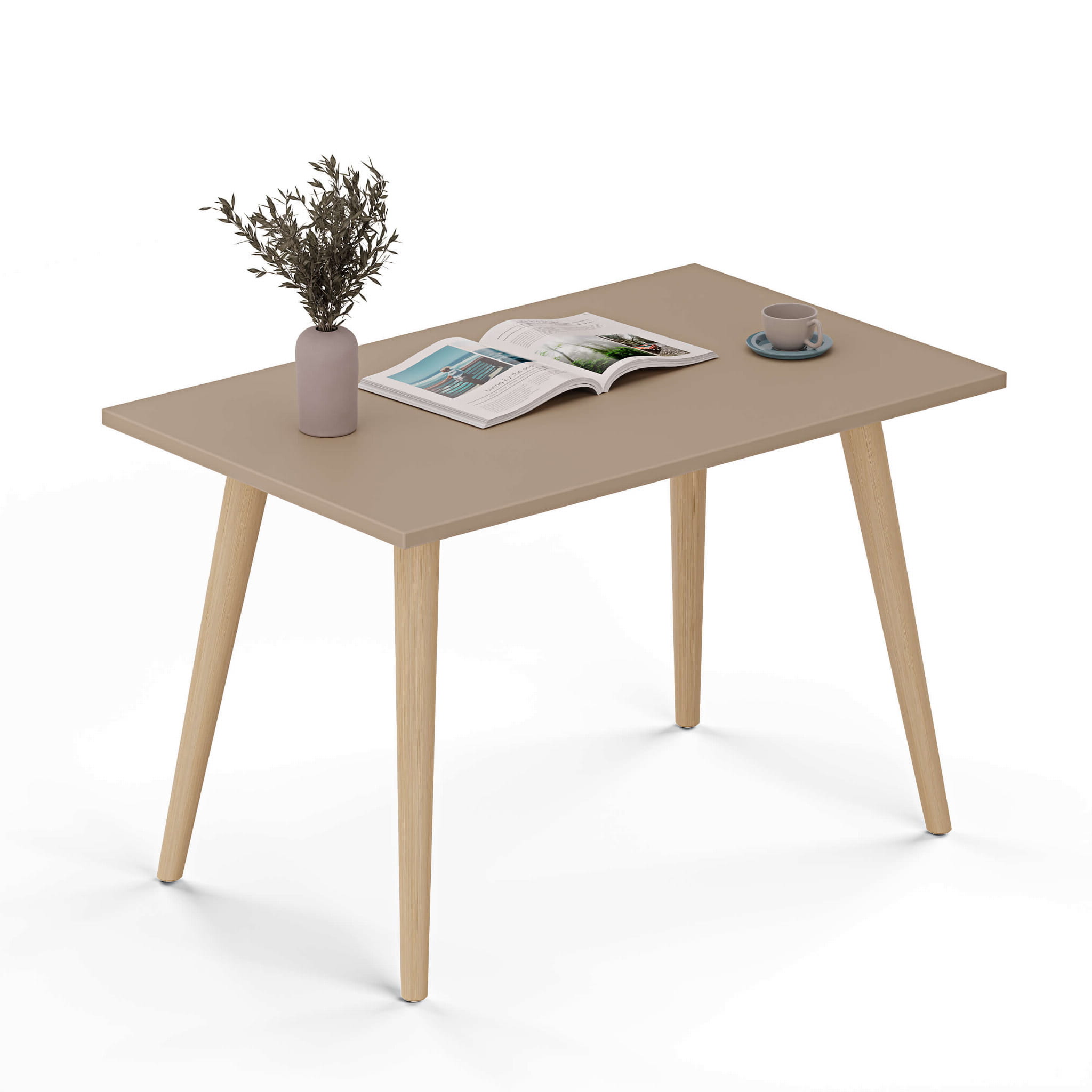 Prosty i estetyczny stolik kawowy to wygodny mebel, który wpasuje się w niemal każde wnętrze. Jasny i funkcjonalny design sprawia, że komponuje się doskonale zarówno w nowoczesnych, minimalistycznych salonach, jak i przestrzeniach wypoczynkowych w stylu skandynawskim. Zaokrąglone, zwężane ku dołowi drewniane nogi ustawione pod lekkim skosem do solidnego blatu dodają lekkości konstrukcji, zapewniając jednocześnie stabilność.