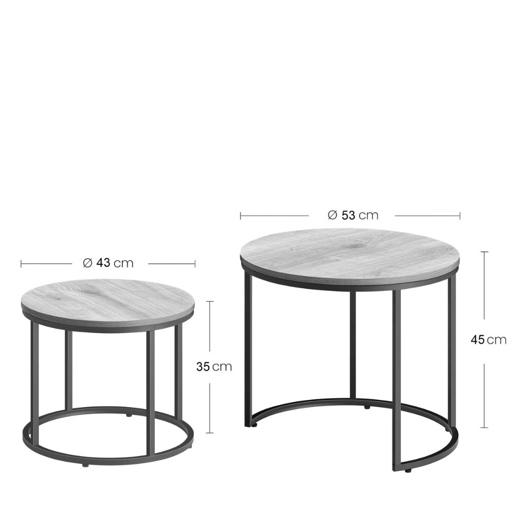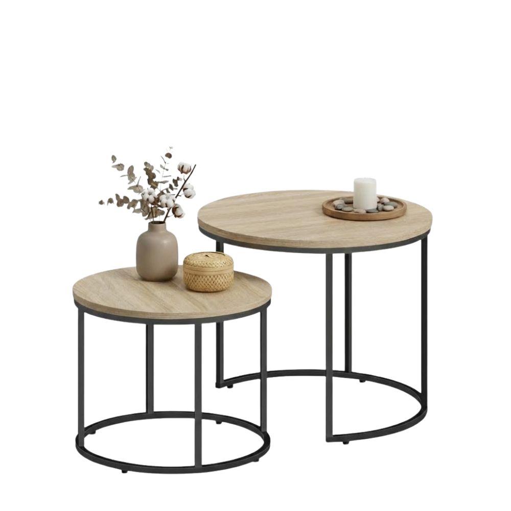 Zestaw stolików kawowych Luvia to propozycja dla osób ceniących nowoczesny design połączony z wysoką funkcjonalnością. Komplet składa się z dwóch okrągłych stolików o różnych rozmiarach, które wprowadzają do wnętrza harmonię i industrialny sznyt. Dzięki inteligentnej konstrukcji typu nesting, mniejszy stolik można całkowicie wsunąć pod większy, co pozwala błyskawicznie odzyskać przestrzeń w salonie, gdy nie jest ona potrzebna.